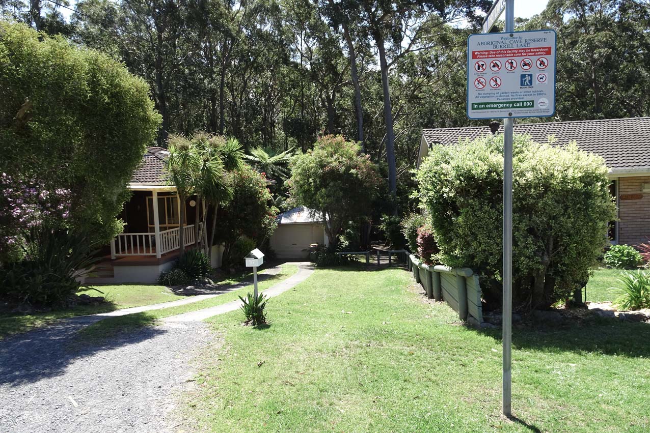 A small track between houses (sign posted) can be found along Wyoming Avenue just off the Princes Highway south of the BIG4 Bungalow Park on Burrill Lake. This is a fairly narrow street with limited parking but well worth the visit to walk through the bush to this historic site. It is only a short walk to the caves and signs at the entrance tell of its history and importance to local Aboriginals.