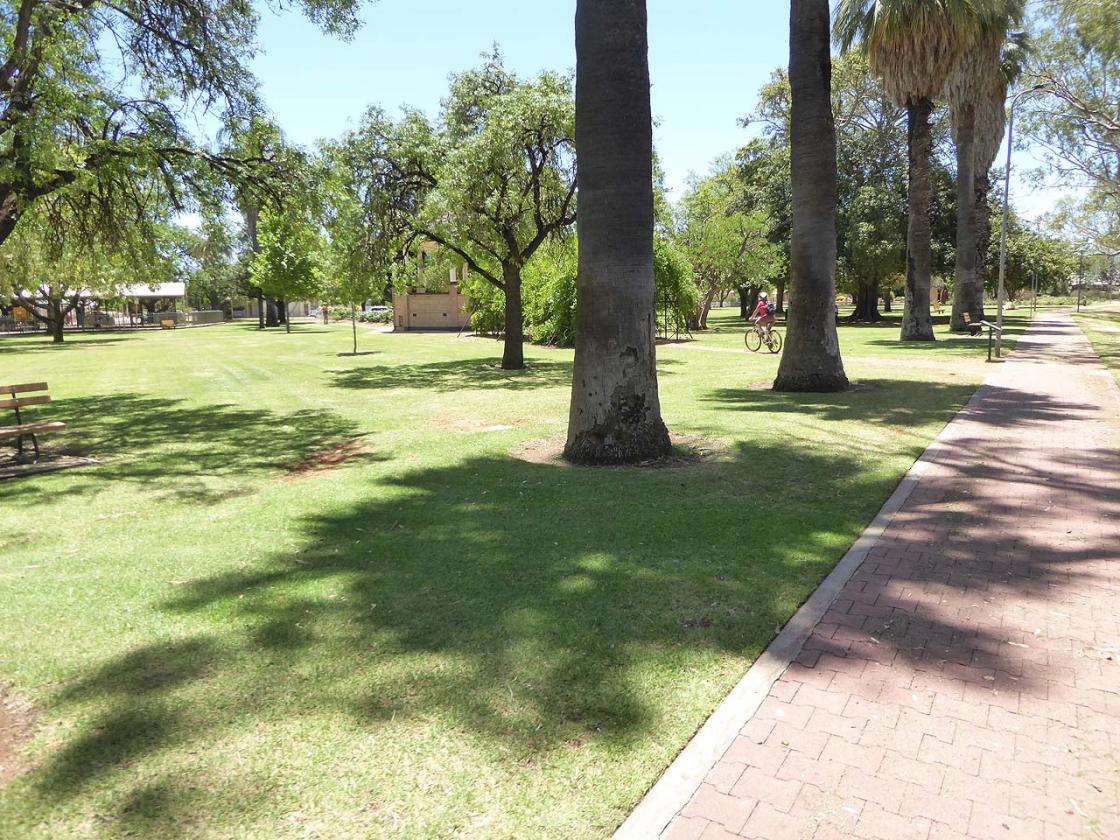 We rode past a section of the Jarrett Memorial Garden when cycling along the foreshore of the Murray River in Renmark, South Australia. Renmark Citizens Bandstand sits in the middle of the parkland with sealed paths leading to it from every direction.